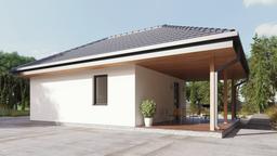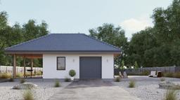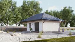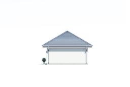 uAG5 jest to projekt garażu jednostanowiskowego wolnostojącego o powierzchni użytkowej blisko 40 m2. W projekcie tym wyodrębniono właściwe pomieszczenie garażu oraz pomieszczenie gospodarcze. Dach budynku został wysunięty i pełni funkcję zadaszenia tarasu znajdującego się po lewej stronie budynku. Zyskujemy dzięki temu miejsce rekreacyjne idealne na letnie przyjęcia lub praktyczne zadaszenie do przechowywania drewna lub rowerów.