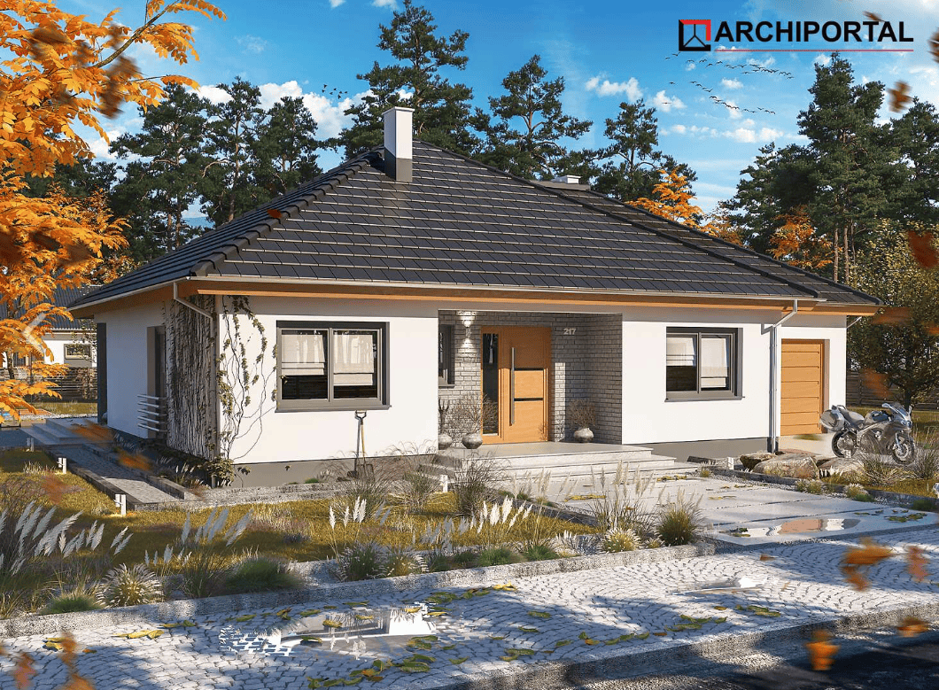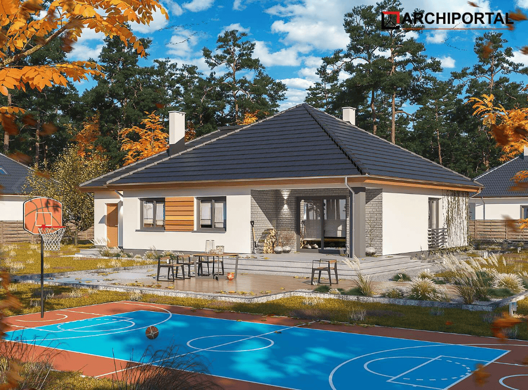 Wersja z garażem popularnego projektu TRYTON. Prosty dom parterowy z czterospadowym dachem i wytrzymałym, ale tanim w budowie stropem TERIVA. Do dyspozycji mieszkańców jest duży, dobrze oświetlony salon, kuchnia z praktyczną spiżarnią, 3 ustawne pokoje, łazienka z miejscem na wannę i prysznic oraz niewielka pralnia. Przez garderobę dostaniemy się natomiast do garażu, za którym znalazła się spora kotłownia. W domu zaprojektowano 2 rodzaje ogrzewania: GAZOWE oraz na PALIWO STAŁE. Dzięki takiemu zabiegowi, projektu nie trzeba przerabiać, inwestor sam decyduje, który rodzaj ogrzewania zastosuje w swoim domu - dokumentacja zawiera schematy i rozwinięcia instalacji c.o. i elektrycznych dla obydwu rozwiązań.
