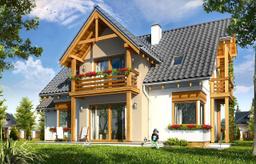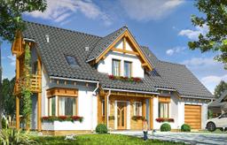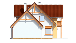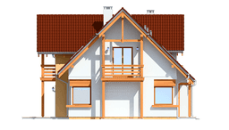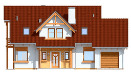 Gotowy projekt Bartek to prosta bryła z poddaszem użytkowym, przykryta dwuspadowym dachem, z dobudowanym garażem. Dom ozdabiają od frontu i od ogrodu duże lukarny z ciekawymi drewnianymi detalami. Również szczyt projektu Bartek został ozdobiony ciekawie zaprojektowanym balkonem z daszkiem. W projekcie Bartek nawiązanie do tradycji łączy się z nowoczesnością. Narożne okna projektu Bartek, czy duże przeszklone drzwi na taras dodają nowoczesnego sznytu.