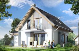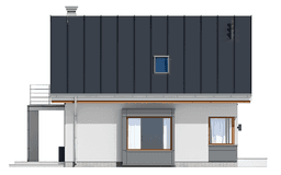 Projekt domu Gucio 2 to nowoczesny niewielki domek dla 4- 5-osobowej rodziny. Parterowy budynek przekryty dwuspadowymi dachami, z dobudowanym do głównej bryły garażem. Dom zaprojektowano, aby dać jak największy komfort przyszłym mieszkańcom, tworząc otwartą przestrzeń dzienną, charakterystyczną dla dużych domów jednorodzinnych. Salon połączony z holem, aneksem jadalnym z wykuszem, wyeksponowanymi reprezentacyjnymi schodami będzie wspaniałym miejscem do życia dla przyszłych domowników. Kominek w domu Gucio 2 usytuowany został na ścianie zewnętrznej, co pozwoli rozkoszować się widokiem ognia i ogrodu równocześnie. Duże przeszklone drzwi łączą pokój dzienny z częściowo zadaszonym tarasem. Na parterze znajduje się też wygodna kuchnia, przedsionek, kotłownia, wc z natryskiem i garaż. Na poddaszu zaprojektowano trzy wygodne sypialnie z niewielkimi "skosami", oraz z wbudowanymi szafami - garderobami. Dodatkowo na poddaszu znajduje się ładna łazienka. Nad garażem mieści się strych gospodarczy dostępny z garażu. Architektura domu podkreśla prostotę form, nowoczesność w doborze materiałów, co wszystko razem tworzy udaną kompozycję. Dom jest łatwy w budowie i niedrogi w późniejszym utrzymaniu. Projekt domu Gucio 2 dostępny jest także w wersji odbicia lustrzanego oraz w wersji bez garażu projekt domu Gucio.