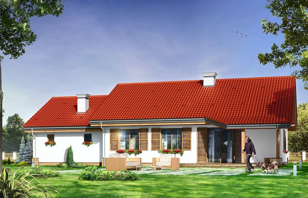 Projekt domu Niezapominajka z garażem 2 to wariant popularnego projektu Niezapominajka – tym razem z podwójnym garażem i obszerną częścią gospodarczą. Projekt domu Niezapominajka z garażem 2 to dom jednorodzinny, parterowy, przeznaczony dla 4- 5-osobowej rodziny. Prostokątna bryła budynku z dobudowanym garażem została przekryta dwuspadowymi dachami. Nieużytkowy strych nad parterem można zaadaptować na poddasze. Architektonicznie dom nawiązuje do typowej tradycyjnej stylistyki. Front domu z zaakcentowanym gankiem wejściowym wspartym na dwóch kolumnach z oknami po bokach, przypomina polski dworek. Wnętrze domu podzielono na część dzienną, z salonem, holem i częściowo otwartą kuchnią, oraz część nocną z trzema sypialniami i łazienką. Zaletą tej wersji projektu jest kotłownia przeniesiona do pomieszczenia za garażem, dzięki czemu dom można ogrzewać gazem, ale też zamiennie paliwem stałym. Projekt domu Niezapominajka z garażem 2 stanowi świetną propozycję dla inwestorów chcących niedrogo wybudować dom, którzy planują zostawić sobie możliwość wykończenia w drugim etapie dodatkowej przestrzeni na strychu – lub po prostu mieć duży przydatny przecież strych. Pracownia posiada wersję odbicia lustrzanego projektu oraz innych jego wariantów: projekt domu Niezapominajka, projekt domu Niezapominajka z garażem.