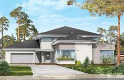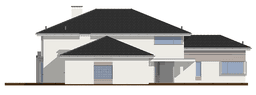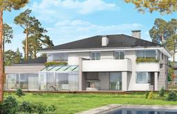 Projekt domu Prestiżowy to jeden z największych i najbardziej komfortowych w ofercie pracowni. Zaplanowany jako nowoczesna, piętrowa willa, o rozczłonkowanej, rozbudowanej bryle. Dom przewidziano dla dużej, 4- 7-osobowej rodziny. Zewnętrzna bryła to połączenie piętrowego rdzenia domu, z dobudowanymi parterowymi skrzydłami, oraz oranżerią i zadaszonym tarasem od strony ogrodu. Modernistyczne detale projektu takie jak fragmenty płaskich dachów, tarasy na piętrze, duże przeszklenia, czy narożne okna nadają domowi bardzo elegancki, ponadczasowy charakter. Wnętrze domu Prestiżowy zaprojektowano oddzielając jednoprzestrzenną część dzienną na parterze od intymnej części z sypialniami. Na parterze umieszczono duży salon otwarty na ogrodową oranżerię, połączony z pięknie oświetloną jadalnią i holem z reprezentacyjnymi schodami i otwarciem przestrzennym na antresolę na piętrze, a także z pokojem sportowym połączonym z zadaszonym podcieniem z kominkiem zewnętrznym. Z holu i jadalni docieramy do wygodnej kuchni z wyspą i spiżarnią. Z narożnego okna kuchennego obserwować można wejście do budynku. Przedsionek wejściowy jest całkowicie przeszklony - tak, aby wejście do domu miało maksymalnie reprezentacyjny charakter. W projekcie Prestiżowy, na parterze znajduje się sypialnia państwa domu z garderobami, łazienką i własnym tarasem, oraz dodatkowy pokój gościnny. W osobnej części domu umieszczono pomieszczenia gospodarcze i garaż. Piętro to królestwo dzieci - aż cztery sypialnie, w tym jedna z własną łazienką, oraz gabinet-biblioteka, z pięknym oknem narożnym z widokiem na front działki. Projekt domu Prestiżowy dostępny jest także w wersji odbicia lustrzanego.