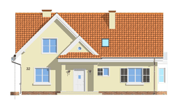 Projekt domu Wesoły to niewielki domek jednorodzinny o ciekawej bryle. Posiada przecinające się krzyżowo dwuspadowe dachy. Tworzą one budynek w kształcie litery L - osłaniającą taras od strony ogrodu. Projekt Wesoły charakteryzuje się prostą konstrukcją, urozmaiconą ciekawym portykiem wejściowym, wykuszem jadalni, dającymi atrakcyjną całość. Wnętrze domu Wesoły to na parterze prócz salonu zaprojektowano dodatkowy pokój mogący służyć np. za sypialnię. Na poddaszu mieszczą się trzy wygodne pokoje z łazienką. Na parterze salon i holl z wyeksponowanymi schodami tworzą jedno duże wnętrze. Częściowo otwarta kuchnia potęguje wrażenie przestrzenności. Pracownia posiada również projekt Wesoły w odbiciu lustrzanym.