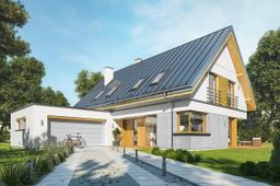 Projekt domu Viking 5 jest powiększoną wersją projektu z serii „Viking”, o wydłużonej bryle głównej, z większym salonem i pustką z antresolą nad częścią dzienną. Jest superkomfortową propozycją domu dla 4- 6-osobowej rodziny - nowoczesnego, funkcjonalnego, o bardzo atrakcyjnej sylwetce i wnętrzu. Projekt domu Viking 5 został poszerzony w stosunku do bazowego projektu, przez co wygląda bardziej reprezentacyjnie i okazale. To komfortowa nowoczesna willa, z ciekawymi materiałami i detalami, oraz pięknymi szerokimi przeszkleniami otwierającymi wnętrze na ogród. Zastosowane materiały: pokrycie dachu z blachy na rąbek, okładziny ścian z drewna czy płyt włóknowo-cementowych, oraz podział elewacji na poziome pasy, dają atrakcyjny wygląd zewnętrzny budynku. Wnętrze: do domu wchodzimy przeszklonym otwartym przedsionkiem wprost do pokoju dziennego, łączącego hol, salon i jadalnię. Przed nami, dzięki szerokim oknom otwiera się od razu widok na ogród i taras. Dodatkowo atrakcyjności wnętrza dodaje pustka nad salonem z antresolą na poddaszu. Przy jadalni mamy ładną ustawną kuchnię ze spiżarnią, a z drugiej strony parteru dodatkowy pokój, łazienkę i pomieszczenia gospodarcze z garażem. Na poddaszu zaprojektowano trzy sypialnie: dwie dziecięce - równej wielkości, z szafami wbudowanymi i łazienką, oraz sypialnię rodziców z dwiema garderobami i własną łazienką. Część rodziców oddziela od części dzieci - jak mostem - pustka nad salonem, antresola, oraz pralnia. Dom nie należy do najmniejszych, ale nie jest też kilkusetmetrową rezydencją. Został zaprojektowany dla Inwestorów, którzy chcą mieszkać maksymalnie komfortowo, nowocześnie, ale nie zamierzają stać się niewolnikami swojego przyszłego domu. Wszystko z umiarem. Projekt domu Viking 5 dostarcza luksusowych doznań, spełnia marzenia, ale za rozsądną cenę. Dostępna jest także wersja domu w odbiciu lustrzanym, wersja podstawowa (projekt domu Viking), pomniejszona z garażem jednostanowiskowym (projekt domu Viking 2), bez garażu (projekt domu Viking 3), z pomieszczeniem nad garażem (projekt domu Viking 4). Do tego budynek jest energooszczędny i dość łatwy w budowie. Czego chcieć więcej. Vikinga można łatwo dostosować do standardu NF40. Zapraszamy.