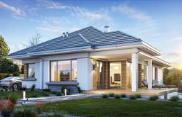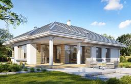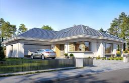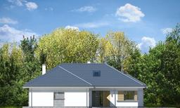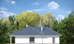 Projekt domu Sielanka to parterowy wygodny dom jednorodzinnego dla czteroosobowej rodziny, zakomponowany na planie litery „L”, przykrytego łagodnym wielospadowym dachem. Dzięki układowi wejścia i wrót garażowych tworzących wejściowy placyk - dziedziniec, dom można postawić na działce frontem lub bokiem do drogi. Dzięki temu projekt domu Sielanka będzie się świetnie nadawał zarówno na działkę z ogrodem z tyłu domu, jak i działkę z ogródkiem z boku, przy mniej korzystnym układzie działki względem słońca. Jednocześnie wejściowo-wjazdowy placyk zapewni komfortowe parkowanie autem przed garażem. Architektura domu utrzymana jest w spokojnej nowoczesnej stylistyce, z ładnymi detalami, dużymi przeszkleniami i grafitowym dachem kryjącym strych – poddasze. Do domu wchodzimy ciekawie zaakcentowanym podcieniem wejściowym do sieni z szatnią, połączoną z garażem i częścią gospodarczą domu. Z sieni przechodzimy do otwartej przestrzeni dziennej połączonego salonu z jadalnią i kuchnią. Salon z pięknymi przeszkleniami otwiera się na częściowo zadaszony taras i ogród. Kuchnia ze spiżarnią otwiera się narożnym oknem na front domu i wejście. W salonie zaprojektowano ścianę kominkowo – telewizyjną, oraz miejsce na narożne meble wypoczynkowe, a także wygodny stół jadalny. Pod zadaszeniem tarasu zmieście się komplet mebli ogrodowych. W części nocnej domu mamy trzy sypialnie z garderobami i szafami wbudowanymi i łazienkę, oraz schody na strych. Strych może być łatwo zaadaptowany na poddasze użytkowe z dodatkowym jednym –dwoma pokojami. Projekt domu Sielanka to doskonała propozycja dla Inwestorów planujących budowę niewielkiego ale komfortowego parterowego domu, z zapasem przestrzeni do wykorzystania nad parterem. Dom jest praktyczny, funkcjonalny i energooszczędny. Budynek ma prostą konstrukcję i bez kłopotu da się go wybudować za rozsądne pieniądze.