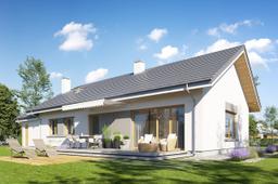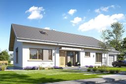 Projekt domu Wymarzony 10 to kolejny dom z kolekcji naszych projektów „Wymarzonych”. Jest to najprostsza i najbardziej ekonomiczna wersja z tej serii domów. Prostokątną bryłę z dobudowanym garażem przekryto dwoma dachami dwuspadowymi o kącie nachylenia 30 stopni. Projekt domu Wymarzony 10 ma nowoczesną ale powściągliwą w wyrazie stylistykę i łączy tradycyjną bryłę z nowoczesnymi detalami i materiałami wykończeniowymi.Połączenie białych tynkowanych ścian z szarymi wstawkami, grafitową dachówką, oraz drewnianymi ramami okien, dają elegancki i czysty wygląd budynku. Główne ozdoby elewacji to : wejście z daszkiem i ładnymi drzwiami frontowymi, oraz strefa tarasowa od ogrodu z dużymi przeszkleniami z salonu i markizą. Dom zaprojektowano na działkę z ogrodem i oświetleniem słonecznym z tyłu lub z boku budynku. Wnętrze : dom mieści w sobie wygodną cześć dzienną, oraz aż pięć dodatkowych pokoi, co przy niewielkiej powierzchni domu jest bardzo dobrym wynikiem. Dom Wymarzony 10 może być swobodnie użytkowany nawet przez rodzinę 2 + 4. Pokoje mogą być zagospodarowane jako sypialnie dziecięce, albo jeden z pokoi - na przykład ten przy wejściu – może pozostać domowym biurem / gabinetem. Do domu wchodzimy wygodnym przedsionkiem do części dziennej, z salonem, jadalnią i półotwartą kuchnią. W salonie przewidziano ścianę kominkowo – telewizyjną, miejsce na wygodny wypoczynek, a szerokie drzwi balkonowe otwierają pokój dzienny na taras i ogród. Z salonu holem przedostajemy się do części nocnej domu, z sypialnią rodziców z garderoba, oraz sypianiami dzieci. Dalej jest połączenie z częścią garażowo-gospodarczą budynku, przez pomieszczenie gospodarcze, do garażu i kotłowni. Strych nad parterem zaprojektowano jako przestrzeń magazynową, na którą dostajemy się schodkami drabinkowymi. Projekt domu Wymarzony 10 to wygodny dom dla nawet sześcioosobowej rodziny - funkcjonalny i praktyczny. Budynek jest energooszczędny, ma prostą konstrukcję, będzie łatwy w budowie i tani w utrzymaniu. Zapraszamy do zapoznania się z pełną ofertą pracowni MG Projekt tej serii: Wymarzony, Wymarzony 2, Wymarzony 3, Wymarzony 4, Wymarzony 5, Wymarzony 6, Wymarzony 7, Wymarzony 8, Wymarzony 9, Wymarzony 11.