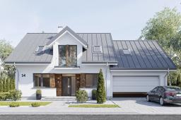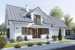 Gotowy projekt Narcyz 2 to parterowy dom z poddaszem użytkowym, zbudowany na planie prostokąta, przykryty dwuspadowym dachem. Do głównej bryły projektu Narcyz 2 dobudowany jest dwustanowiskowy garaż z poddaszem. Symetryczną proporcjonalną elewacją frontową projektu ozdabia podcień wejściowy i szeroka lukarna z balkonem. Elewację ogrodową projektu Narcyz 2 urozmaica zadaszenie tarasu, oraz szerokie przesuwne drzwi balkonowe projektu Narcyz 2 otwierające salon na taras i otaczający dom ogród.