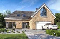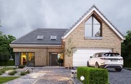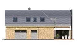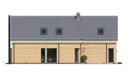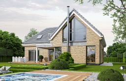 Projekt domu Willa Eska 2 - projekt domu jednorodzinnego z serii projektów o tej samej nazwie. Projekt jest parterowym domem jednorodzinnym z użytkowym poddaszem, przeznaczonym dla 4- 5-osobowej familii. Nazwa domu nawiązuje do kształtu bryły przypominającej literę „S”, tworzącej bardzo korzystny funkcjonalnie i wizualnie plan - z dziedzińcem frontowym i z tylnym ogrodowym patio. Ideą projektu jest połączenie nowoczesnej architektury, detali i funkcji, z tradycyjnym kształtem budynku z dwuspadowym dachem. Dobrze dobrane proporcje, podziały miedzy powierzchnią ścian a przestrzeniami okien tworzą harmonijną sylwetkę domu, o ludzkiej skali. Front domu ozdabia reprezentacyjne wejście z naświetlami, zaakcentowane wnęką i daszkiem. Urozmaiceniem elewacji frontowej jest narożne okno kuchenne, oraz piękne wysokie okno na poddaszu z sypialni rodziców. Od strony elewacji ogrodowej atrakcyjności dodają duże okna salonu, oraz prostopadłościenny przeszklony wykusz klatki schodowej wykończony blachą na rąbek. Udane proporcje domu i gustownie dobrane materiały wykończeniowe, dają spójny atrakcyjny estetycznie efekt. Dodatkową ozdobą sylwetki budynku są oryginalne gzymsowania okapów. Wnętrze domu zaprojektowano w podziale na części: dzienną, gospodarczą i dodatkowy pokój na parterze, oraz część sypialną na poddaszu. Wchodząc do domu przez przeszklony przedsionek dostajemy się do reprezentacyjnego holu z pięknymi schodami i oknem na ogród. Z holu przechodzimy do części dziennej - z salonem, jadalnią i kuchnią. Nad salonem zaprojektowano otwarcie przestrzenne z antresolą. Komfortowa kuchnia z wyspą stanowi przedłużenie pokoju dziennego. Dzięki poprzecznemu ciągowi komunikacyjnemu uzyskano łatwe i praktyczne przejście z garażu, przez przedsionek i spiżarnię do kuchni. Na parterze wydzielono dodatkowy pokój z łazienką – sypialnię gościnną, lub seniora, lub pokój do pracy z dostępem do tarasu ogrodowego. Pozostałe pomieszczenia na parterze to dwustanowiskowy garaż i kotłownia. Na poddaszu zaprojektowano dwie sypialnie dziecięce z osobną łazienką, oraz apartament państwa domu z łazienką i garderobą. Spory hol może pełnić dodatkową funkcję bawialni. Na antresoli nad salonem można postawić domową bibliotekę i wygodną kanapę, albo biurko do pracy. Willa Eska to oryginalny, komfortowy dom jednorodzinny o nowoczesnym, trochę loftowym stylu, z wieloma cieszącymi oko detalami architektonicznymi. Dom inny, różniący się od setek sztampowo powtarzalnych budynków. Dom uwzględnia nowoczesne energooszczędne rozwiązania materiałowe i instalacyjne - będzie tani w eksploatacji, a w samej budowie nie powinien być trudny ani drogi. Stanowi doskonałą propozycję do osób ceniących ciekawą architekturę i nietuzinkowe rozwiązania. Zapraszamy !