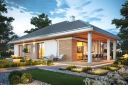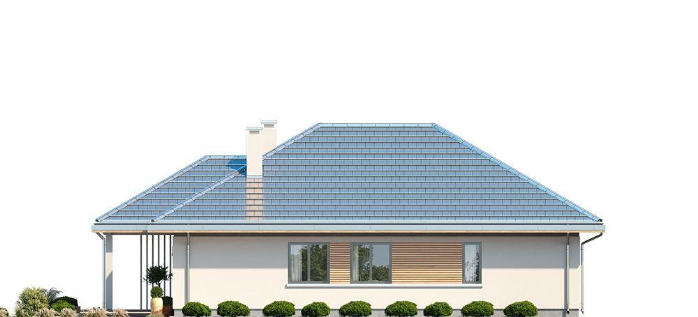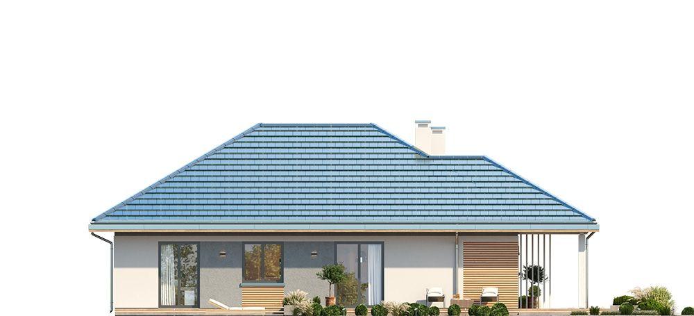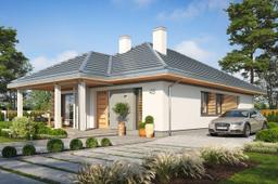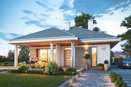 Projekt domu Dom na Południowej jest to projekt niewielkiego parterowego domu jednorodzinnego, przeznaczonego dla 3- 4-osobowej rodziny, na wąską działkę z niekorzystnym usytuowaniem względem drogi dojazdowej, stron świata i nasłonecznienia, czyli dla działek z wjazdem od południa. Wielu Inwestorów posiada takie parcele i przez serię „Domów na Południowej” chcieliśmy udowodnić, że na takiej działce również da się zaprojektować i zbudować bardzo sensowny dom. Budynek zaprojektowano na planie prostokąta z wystającym w kierunku frontu zadaszeniem podzielonym na cześć wejściową, oraz część będącą zadaszeniem tarasu ogrodowego. Dom nie posiada garażu - ma z boku miejsce parkingowe, które można dość łatwo zamienić na wiatę garażową dobudowując dodatkowe zadaszenie. Patrząc na front domu: narożnik prawy to strefa wejściowa, natomiast narożnik lewy to taras i cześć wypoczynkowa. Dom powinien być sytuowany nieco głębiej na działce, aby zapewnić odpowiednie wymiary ogrodu od frontu i z boku domu. Bryła budynku jest prosta, nowoczesna, w ciekawej kolorystyce. Architektura domu łączy w sobie wrażenie solidności i prostoty. Wnętrze domu zaprojektowano dzieląc je na część dzienną od strony tarasu, oraz po drugiej stronie parteru - na część z pokojami sypialnymi. Do wnętrza wchodzimy przez obszerny przedsionek połączony z pomieszczeniem gospodarczym (kotłownia i pralnia), do jednoprzestrzennego wnętrza połączonego salonu, kuchni i holu. Narożny układ salonu doświetla wnętrze od frontu i od boku działki. Kuchnia z półwyspem i spiżarnią jest trochę cofnięta, ale stanowi część przestrzeni dziennej. Całość wnętrza zamykają trzy pokoje sypialne, z apartamentem rodziców z garderobą i własną łazienką. Nad planem parteru przewidziana jest przestrzeń strychowa do dowolnego wykorzystania, dostępna z korytarza za pomocą schodków drabinkowych. Konstrukcja domu jest bardzo prosta, łatwa i niedroga w budowie. Część murowana budynku kończy się na wieńcach nad ścianami parteru, a pozostałą konstrukcję stanowi układ drewnianych wiązarów, będących jednocześnie stropem, oraz więźbą dachową. Takie rozwiązanie znakomicie upraszcza budowę, przyspiesza ją i co najważniejsze - obniża koszt realizacji budynku. Zastosowane rozwiązania, materiały, izolacje i instalacje dają w rezultacie tani, prosty w budowie, energooszczędny dom - niedrogi w późniejszym utrzymaniu. To bardzo praktyczny wybór dla Inwestorów, którzy nie chcę spędzić następnych pięciu lat na budowie i kolejnych dziesięcioleci płacąc kredyt za zbyt duży i zbyt skomplikowany dom marzeń. Realizacja marzenia może być prosta, łatwa i przyjemna - taki właśnie jest Dom na Południowej. Zapraszamy !