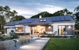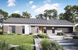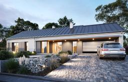 Projekt domu Dom na Szerokiej jest to projektu domu jednorodzinnego z serii „Dom na Szerokiej”. Jest to projekt parterowego budynku, zbudowanego na planie prostokąta, przykrytego dwuspadowym symetrycznym dachem, o szerokiej – zgodnie z nazwą – elewacji frontowej. Dom przeznaczony jest na działki płytkie, z małą głębokością między drogą a tyłem parceli, lub na działki z ogrodem z boku domu (wówczas budynek sytuowany jest bokiem do drogi dojazdowej). Dom zaprojektowano dla Inwestorów marzących o parterowym budynku, o maksymalnie szerokim otwarciu części dziennej na taras i otaczający go trawnik. Jednocześnie chcących budować dom o prostej bryle, bez przesadnych udziwnień. To typowy parterowy dom w stylu bungalow. Architektura budynku bardzo przyciąga uwagę. Szerokie reprezentacyjne wejście do domu z przeszkleniami do ziemi, pięknymi drzwiami wejściowymi z naświetlem, oraz długim daszkiem nad podestem wejściowym i podjazdem do garażu dodają domowi prestiżu i nowoczesnego sznytu. Od strony ogrodu mamy piękne przesuwne drzwi z salonu na taras – ogromne przeszklenie powiększające pokój dzienny o ogród. Architektura dom u jest nowoczesna, ale też powściągliwa. Detale wykończeniowe, materiały i kolory dobrano tak, aby stanowiły harmonijną całość. Wnętrze domu zaprojektowano dzieląc je na trzy części: środkową dzienną – z salonem, nocną z sypialniami i gospodarczą – z garażem i kotłownią. Z garażu przechodzimy z zakupami wygodnym przejściem przez kotłownię, albo pod zadaszeniem podcienia wejściowego, lub przez spiżarnię – wprost do kuchni. Zarówno wnętrze dzienne, jak i pokoje sypialne to duże kształtne powierzchnie – bez kompromisów. Do pokoju dziennego przechodzimy z obszernego przedsionka z szafami, przez hol i korytarz. Otwiera się przed nami świetne jasne komfortowe wnętrze - doskonale doświetlone dużymi przesuwnymi drzwiami balkonowymi, oraz oknami połaciowymi w dachu.Nad częścią salonu mamy otwarcie przestrzenne aż do linii dachu - zwiększające kubaturę pomieszczenia. Kuchnia z wyspą, jadalnia i salon zorganizowane są wokół centralnej ściany kominkowo – telewizyjnej oddzielającej salon od korytarza prowadzącego do sypialni. W części nocnej mamy trzy wygodne sypialnie z szafami wbudowanymi, garderobą domową i łazienką. Z sypialni rodziców zaprojektowano urokliwe wyjście na taras. Całość domu zamykają bardzo wygodny dwustanowiskowy garaż, oraz strych nad parterem, który można wykorzystać na domowy magazyn - graciarnię, dostępny z parteru za pomocą schodków drabinkowych. Konstrukcja domu jest bardzo prosta: ściany parteru do wysokości wieńca + konstrukcja stropu nad parterem i więźby dachowej w postaci układu prefabrykowanych wiązarów drewnianych. Takie rozwiązanie znacznie przyspiesza budową, upraszcza ją i – co najważniejsze – jest tańsze. W projekcie zastosowano bardzo dobre izolacje, nowoczesne materiały i instalacje, dzięki czemu budynek będzie tani w późniejszej eksploatacji. Dom na Szerokiej to doskonała propozycja dla Inwestorów chcących budować parterówkę, ale pragnących aby ich dom wyróżniał się na tle innych zwykłych domków. Zapraszamy !