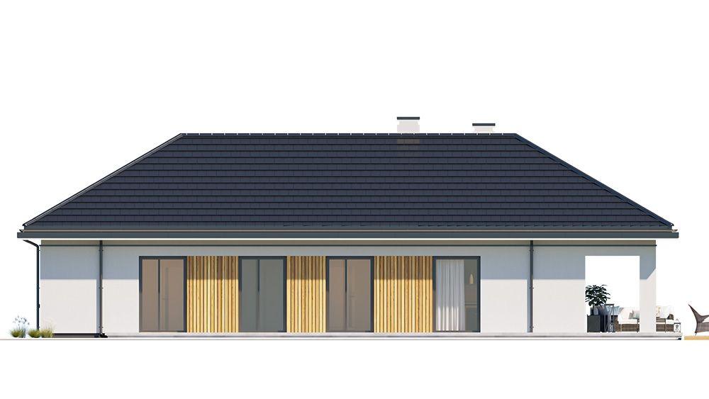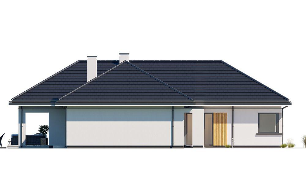 Projekt domu Sielanka 3 jest kolejną wersją projektu z popularnej serii „Sielanek” z MG Projekt. Jest to wersja z dachami czterospadowymi. Sielanka 3 to projekt parterowego budynku, rzutem o kształcie litery T, przykryty wielospadowym dachem, z cofniętym w stosunku do ściany frontowej garażem i wejściem, oraz z elewacją ogrodową z przestronnym zadaszonym tarasem -przesłużeniem salonu. Budynek został zaprojektowany dla 4- 5-osobowej rodziny, chcącej komfortowo mieszkać w parterowym domu, bez biegania po schodach, z bezpośrednim dostępem do ogrodu z każdego pokoju. Dom nadaje się na działkę z ogrodem z tyłu lub z od strony bocznej- zależnie od jego posadowienia i orientacji względem stron świata. Architektura budynku jest nowoczesna, wykorzystująca modne materiały i zestawienia kolorystyczne, wykorzystująca kontrasty między poszczególnymi powierzchniami dla lepszego estetycznego efektu. Front budynku urozmaicono ciekawym podcieniem wejściowym z szerokimi drzwiami z naświetlem bocznym, Dodatkową ozdobą jest narożne okno i okna do podłogi rozdzielone drewnianą okładziną ściany. Całość domu przykryta jest pięknym proporcjonalnym dachem przykrytym grafitową nowoczesną dachówką płaską. Od strony ogrodu najważniejszymi elementami są piękne przeszklenia pokoi, zadaszenie tarasu, oraz same tarasy w kształcie litery L. Wnętrze budynku podzielono na strefy: w części środkowej mamy ogólną przestrzeń dzienną do życia, po lewej stronie część garażowo-gospodarczą, a z prawej strony - pokoje sypialne z łazienkami garderobami. Do domu wchodzimy z zadaszonego podestu wejściowego szerokimi doświetlonymi drzwiami do przedsionka z szatnią i następnie do holu połączonego przestrzennie z salonem i kuchnią. Kuchnia jest otwarta na salon i na ogród. Salon ma podniesiony sufit aż do kalenicy dachu, dzięki czemu jest w nim jeszcze więcej przestrzeni i powietrza. Z holu korytarzem przechodzimy do części prywatnej, gdzie znajdziemy 4 pokoje, wśród nich sypialnię master z podwójną garderobą. Wnętrze dopełnia duża łazienka, wc i pomieszczenie na pralkę, suszarkę i kosze do prania. W części gospodarczej znajdziemy duży dwustanowiskowy garaż, z magazynem, oraz kotłownię. Nad częścią parteru zaprojektowano przestrzeń strychową - magazyn domowych rzeczy „nadprogramowych”, dostępną ze schodów w holu. Strych w dość prosty sposób można zaadaptować na poddasze użytkowe. Konstrukcyjne dom jest zaprojektowany w bardzo prosty sposób. Prace murarskie i betoniarskie kończą się na wieńcach nad ścianami parteru. Pozostała konstrukcja budynku to układ drewnianych wiązarów prefabrykowanych, tworzących strop nad parterem, oraz więźbę dachową. Takie rozwiązanie znakomicie upraszcza budowę, przyspiesza ją - i przede wszystkim obniża koszty. Dom zaprojektowano jako energooszczędny, z dobrymi izolacjami i nowoczesnymi instalacjami. Budynek jest łatwy i szybki w budowie i będzie niedrogi w późniejszej eksploatacji. To świetna propozycja dla Inwestorów szukających domu parterowego, wygodnego i ekonomicznego. Zapraszamy do zapoznania się ze wszystkimi projektami z serii Sielanka: https://www.mgprojekt.com.pl/sielanka, https://www.mgprojekt.com.pl/sielanka-2, https://www.mgprojekt.com.pl/sielanka-2-b, https://www.mgprojekt.com.pl/sielanka-3, https://www.mgprojekt.com.pl/sielanka-4.