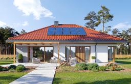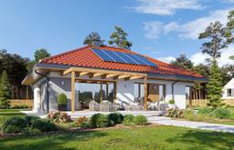 Projekt domu Dom na Praktycznej 3 to projekt parterowego domu jednorodzinnego z serii „Praktycznych”. Projekt wyłamujący się z modnej ostatnio czarno-biało-antracytowej kolorystyki i stylistyki. Zamiast tego mamy domek o ładnej, miłej, przyjemnej dla oka architekturze, z czerwonym dachem i dużą ilością drewnianych wstawek i elementów, tworzących razem pełną wdzięku i ponadczasowej elegancji architekturę. Budynek zaprojektowany jest na planie prostokąta, zwieńczony symetrycznym czterospadowym dachem przykrytym czerwoną dachówką. Nowoczesna forma architektury, połączona z tradycyjną kolorystyką materiałów tworzą udane połączenie. Patrzymy na ten dom i odczuwamy radość i poczucie spełnienia - to realizacja marzenia o własnej przystani, o własnym miejscu na ziemi. Front domu ozdobiony jest szerokimi drzwiami z naświetlem i designeskim zadaszeniem podestu wejściowego. Od strony elewacji ogrodowej główną rolę gra piękne okno salonu otwierające wnętrze na taras, oraz zadaszenie w postaci pergoli ( lub tarasoli ). Wnętrze domu zaprojektowano z zachowaniem podziału na część dzienną i nocną. Do centralnie usytuowanego holu dostajemy się przez duży przedsionek, z którego przechodzimy do części dziennej z salonem i kuchnią, oraz części z sypialniami domowników.