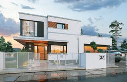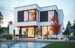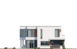 Projekt domu Qubik jest to projekt nowoczesnego domu jednorodzinnego piętrowego, z płaskim dachem - z serii „Qubik”, przeznaczony dla 4- 5-osobowej rodziny. Dom zaprojektowano w prostopadłościennej bryle złożonej z kilku przenikających się ze sobą bloków, tworzących interesującą harmonijną sylwetkę - z zaakcentowanym wejściem w narożniku elewacji frontowej, oraz z zawieszonym nad tarasem fragmentem piętra, tworzącym podcień. Dom otwarto maksymalnie dużymi przeszkleniami na stronę ogrodu, łącząc salon i sypialnie z otoczeniem. Od frontu zaprojektowane zostały trzy narożne okna - kuchni i gabinetu, oraz jednej z sypialni na piętrze, a narożnik ścian wejścia wykonano w kontrastującym kolorze akcentując reprezentacyjne drzwi do domu. Do jednopiętrowej bryły części mieszkalnej dołączona została parterowa część garażowa, z tarasem na dachu garażu, dostępnym z holu piętra. Zastosowane w elewacjach kształty, kolory i materiały dają estetyczny, czysty, bezkompromisowy wygląd - minimalistyczną nowoczesną architekturę. Wnętrze domu ma równie nowoczesny wyraz i charakteryzuje się prostymi podziałami pomieszczeń i wzajemnie przenikającymi się przestrzeniami. Parter domu to przede wszystkim salon otwarty szeroko na taras i ogród, połączony z wysokim holem z pięknymi schodami, z aneksem jadalnym i oddzieloną częściowo kuchnią. Centralnym elementem wnętrza jest tu ściana telewizyjno-kominkowa z trzystronnym kominkiem. Na parterze znajdziemy także dodatkowy pokój - gabinet, oraz garaż z kotłownią. Na piętrze zaprojektowane zostały dwie sypialnie dziecięce z garderobami i dużą łazienką, oraz oddzielny apartament rodziców z własną łazienką i garderobami. Całość spięta jest holem z pustką nad parterem i przejściem na taras na dachu garażu. Qubik to dom o nowoczesnej minimalistycznej architekturze, z zastosowanymi dopracowanymi detalami i energooszczędnymi instalacjami. Budynek ma bardzo korzystny stosunek powierzchni podłóg do kubatury, oraz zwartą bryłę, przez co będzie niedrogi w ogrzewaniu i eksploatacji. Konstrukcja domu jest prosta. Największym wyzwaniem dla Inwestora będzie tutaj dość kosztowna stolarka okienna. Qubik to doskonała propozycja dla osób planujących budowę domu piętrowego z płaskim dachem, posiadających niewielką działkę, którzy chcą zrealizować swoje marzenie o własnym domu trochę inaczej niż inni.
