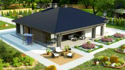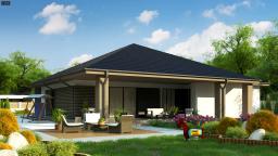 Z344 to wyjątkowy projekt o ciekawym wyglądzie. Charakterystyczny element ciemnego betonu łączącego otwory okienne w połączeniu z jasnym drewnem nadaje mu unikatowy styl. Dom oferuje niezwykle funkcjonalną przestrzeń. Wnętrze domu wyraźnie podzielono na strefę dzienną i nocną. Część reprezentacyjna to przestronny, dobrze doświetlony salon z wyjściem na zadaszony taras. Otwarta kuchnia pozwala na nowoczesną aranżację z wyspą pośrodku. Przy kuchni znajduje się podręczna spiżarnia, a także mniejsza łazienka z natryskiem i miejsce na pojemne szafy w holu. W prywatnej części domowników zaprojektowano trzy komfortowe sypialnie. Każda posiada wyjście na taras. Do największego pokoju przynależy garderoba. W dużej łazience wydzielono dodatkowo pomieszczenie na pralnię. Projekt Z344 to idealna propozycja dla osób ceniących klasykę w nieco nowoczesnym wydaniu.