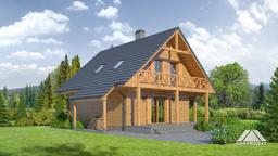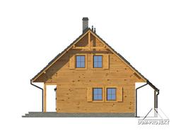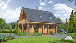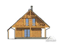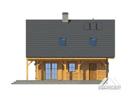 Dom w konstrukcji szkieletu drewnianego. Duży salon z aneksem kuchennym,kominkiem, wyjściem na zadaszony taras i schodami na poddasze. Wiatrołap, łazienka, pomieszczenie gospodarcze. Na poddaszu trzy pokoje, łazienka i komunikacja. Zwarta bryła budynku i dach dwuspadowy sprzyjają szybkiej i taniej budowie i niskim kosztom eksploatacji.