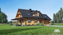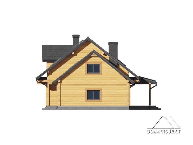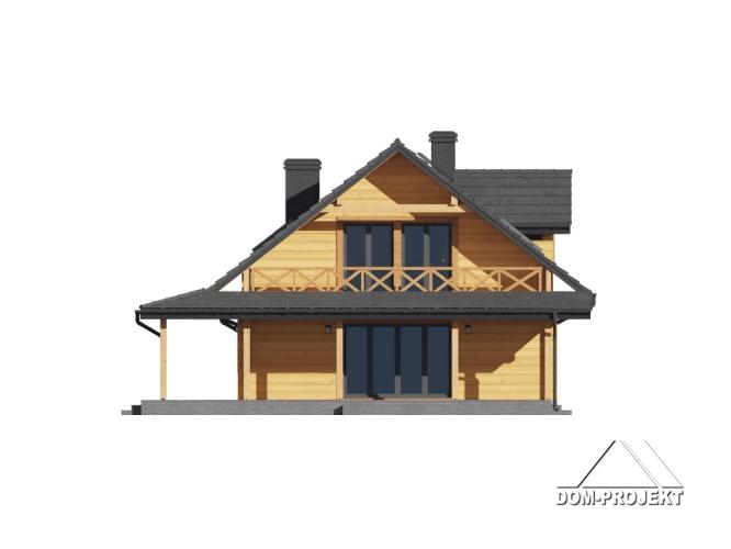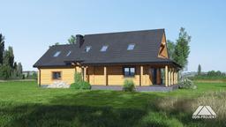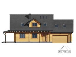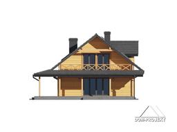 Dom drewniany. Duży salon z aneksem kuchennym, kominkiem i wyjściem na zadaszony taras. Łazienka, wiatrołap i komunikacja. Garaż na dwa samochody, kotłownia. Na poddaszu cztery wygodne pokoje, łazienka, balkon i komunikacja. Prosta bryła budynku i dach dwuspadowy sprzyjają łatwej i szybkiej budowie oraz niskim kosztom eksploatacji.