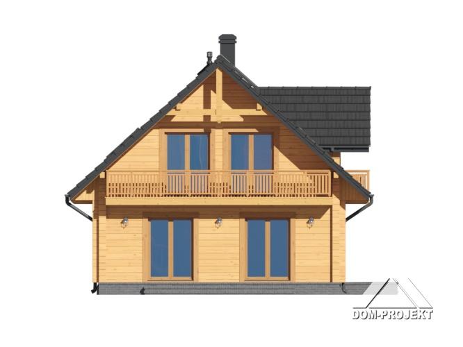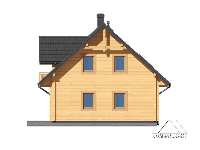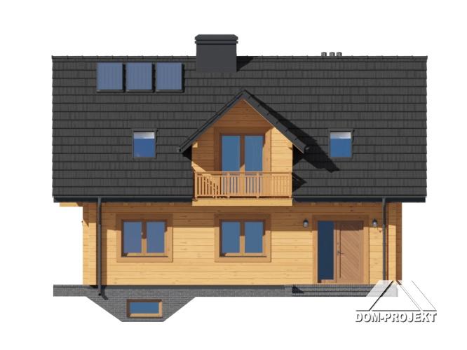 Dom z bali. Podpiwniczony. Duży salon z aneksem kuchennym, kominkiem, wyjściami na taras i schodami na poddasze. Łazienka, wiatrołap, schody do piwnicy. Na poddaszu trzy pokoje, łazienka, komunikacja i dwa balkony. W piwnicach kotłownia, pralnia i pomieszczenia gospodarcze. Instalacja solarna. Zwarta bryła budynku i dach dwuspadowy sprzyjają szybkiej i taniej budowie i niskim kosztom eksploatacji.