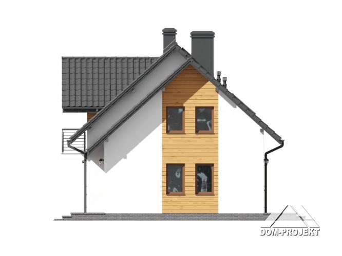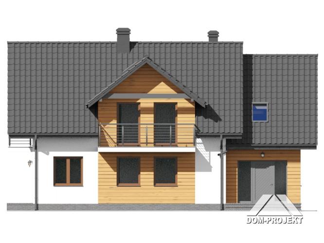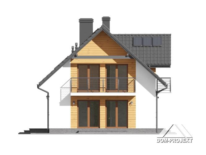 Dom z poddaszem. Duży salon z aneksem kuchennym, kominkiem i wyjściami na taras. Pokój, łazienka, komunikacja, wiatrołap i kotłownia. Na poddaszu cztery pokoje, łazienka, komunikacja i dwa balkony. Zwarta bryła budynku i dach dwuspadowy sprzyjają szybkiej i taniej budowie i niskim kosztom eksploatacji.