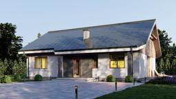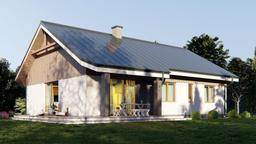 Bryła została zaprojektowana na planie prostokąta, w którym optymalnie rozmieszczono wszystkie niezbędne pomieszczenia. Po przekroczeniu umiejscowionego centralnie na elewacji frontowej, zadaszonego wejścia do domu znajdujemy się w wiatrołapie, z którego poprzez hall przechodzimy do znajdującej się na prawo strefy dziennej. W jej skład wchodzi jasny salon z jadalnią oraz otwarta kuchnia i toaleta. Z salonu oraz jadalni możemy wyjść na częściowo zadaszony narożny taras, który będzie idealnym miejscem wypoczynku w ciepłe letnie wieczory. W strefie nocnej znajdują się trzy wygodne i ustawne sypialnie oraz ogólnodostępna łazienka z wanną i prysznicem.