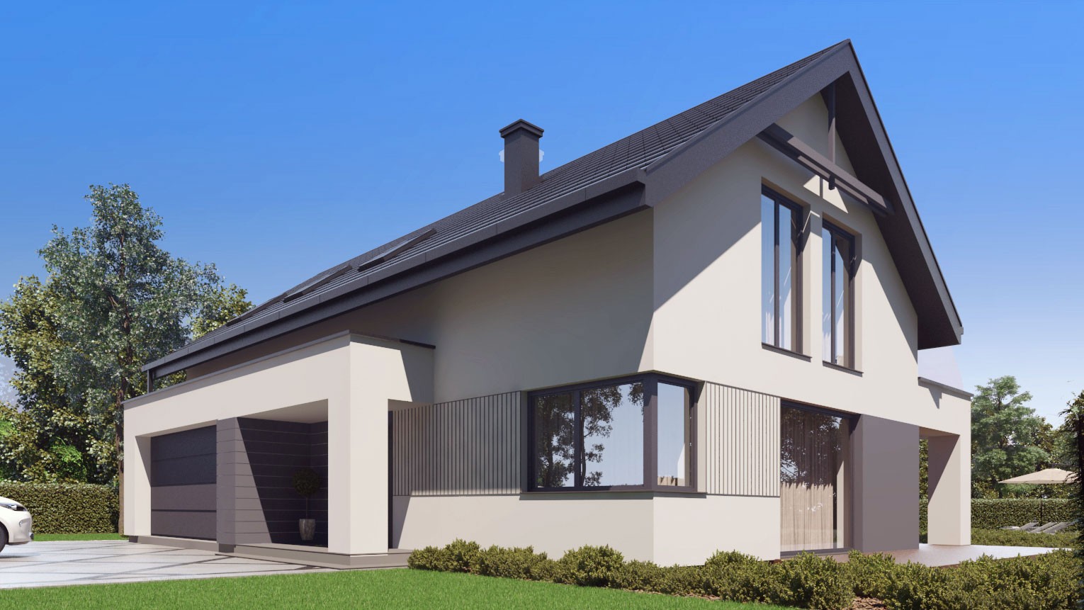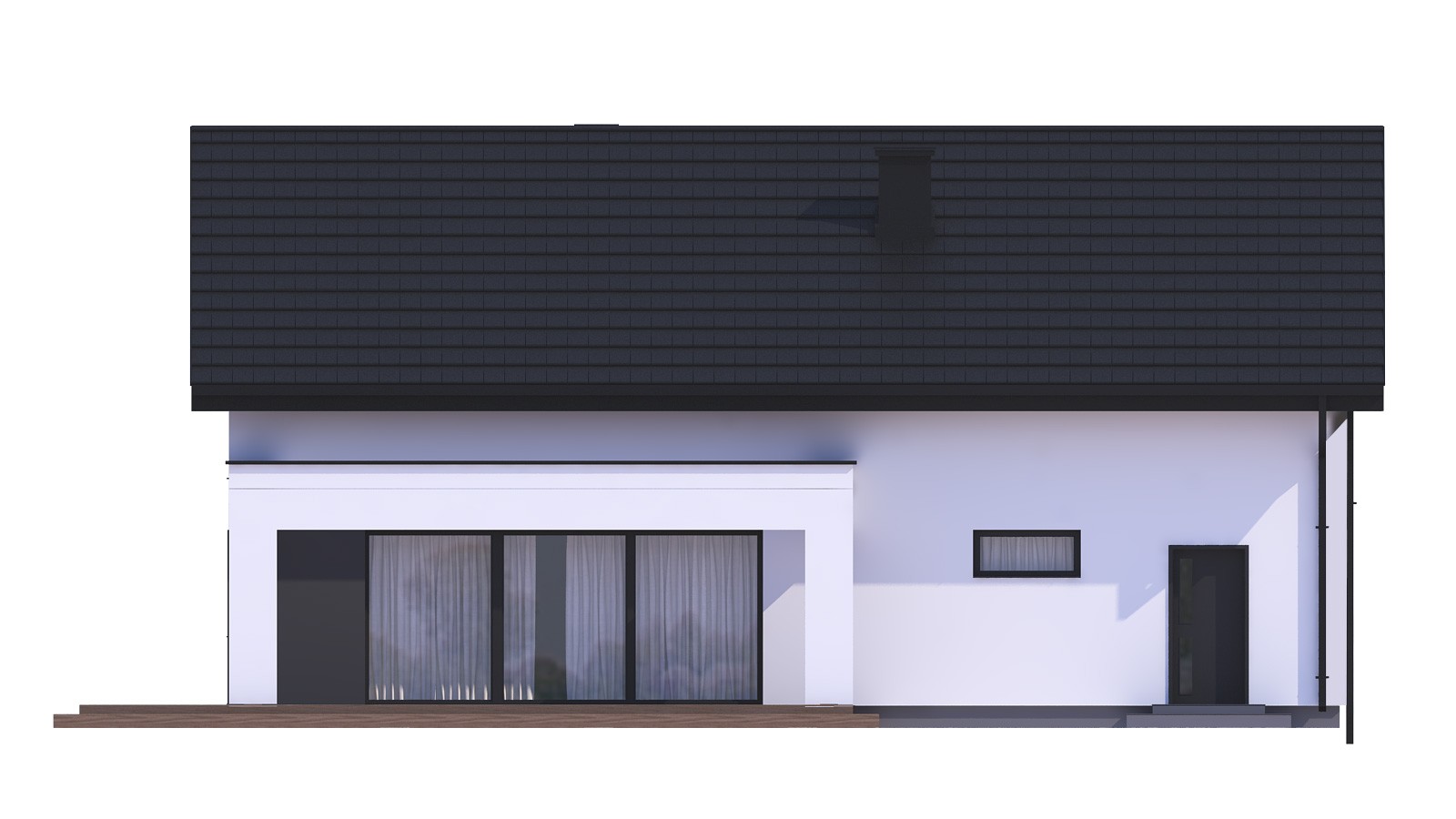 uA156 jest to tradycyjny projekt domu z dwuspadowym dachem o powierzchni użytkowej 138 m2. Zaprojektowane podcienie: frontowe, nadające reprezentacyjny charakter strefy wejściowej oraz ogrodowe, które daje poczucie intymności i pozwoli na chwilę relaksu po ciężkim dniu nadają temu projektowi nowoczesnego charakteru. W bryle budynku znajduje się dwustanowiskowy garaż z pomieszczeniem gospodarczym, połączony przejściem przez wiatrołap z domem. Na parterze w strefie dziennej zaplanowano salon z jadalnią z dużymi oknami i wyjściem na taras, kuchnię z praktyczną spiżarnią oraz niewielkich rozmiarów łazienkę z prysznicem. Na piętrze, czyli w strefie nocnej znajdują się trzy sypialnie w tym jedna główna z garderobą, dodatkowy pokój, który służyć może jako gabinet lub pokój gościnny, pralnię garderobę oraz dużą łazienkę ogólnodostępną w wanną i prysznicem. Projekt uA156 jest to ekonomiczny w budowie i wygodny w mieszkaniu dom dla rodziny 2+2, który swoją architekturą doskonale wpisze się w zabudowę miejską, jak i naturalne otoczenie pól i lasów. Projekt ten występuje również w wariancie 156v1.