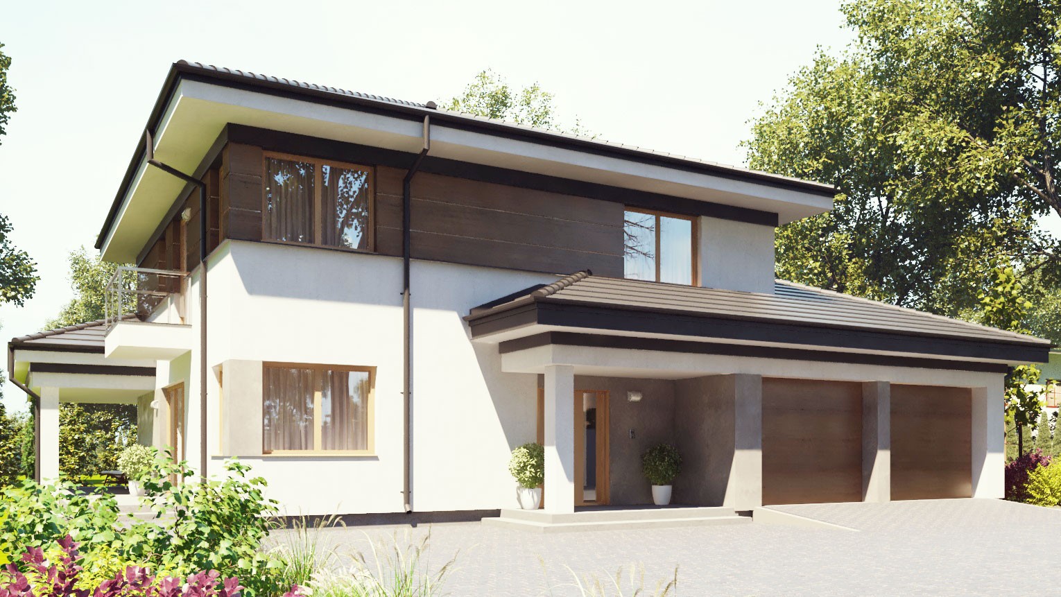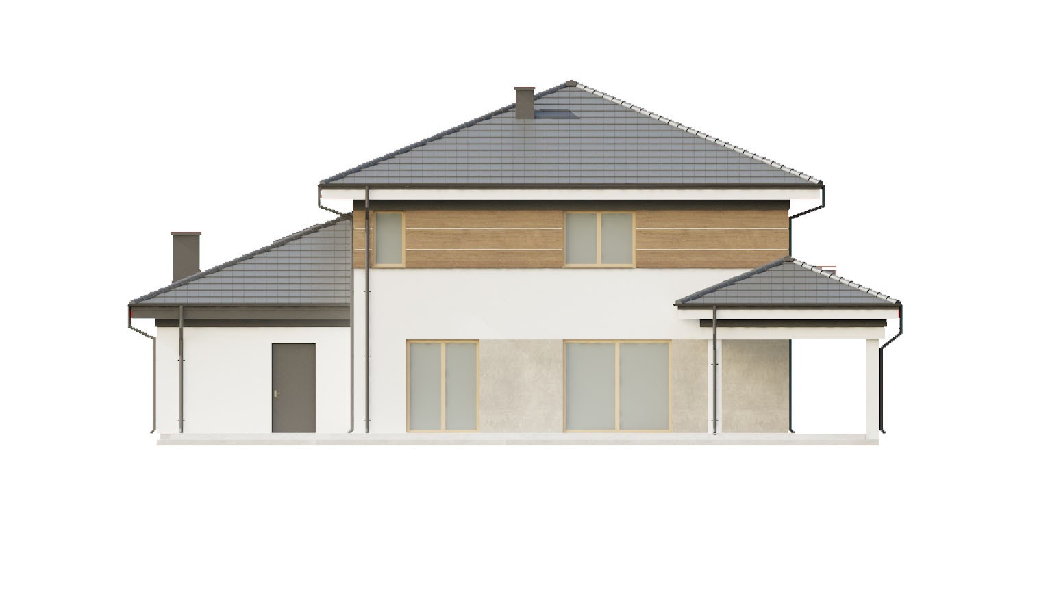 Gotowy projekt domu uA159v2 jest to propozycja wygodnego w mieszkaniu domu piętrowego z wielospadowym dachem i garażem na dwa auta w bryle. Elewacja zewnętrzna utrzymana została w ciepłej tonacji kolorystycznej z wykorzystaniem okładziny z naturalnego drewna. W projekcie zastosowano duże przeszklenia oraz zadaszenia w strefie wejściowej oraz na tarasie, co nadaje bryle budynku nietuzinkowego charakteru. Projekt ten posiada bogaty program funkcjonalny, który trafi w gusta nawet najbardziej wymagających inwestorów. Parter to strefa garażowa oraz strefa dzienna. W skład strefy garażowej wchodzi oprócz garażu także pomieszczenie gospodarcze o dużej powierzchni, które doskonale sprawdzi się przy przechowywaniu licznych ogrodowych sprzętów. Strefa garażowa została płynnie połączona przejściem z częścią mieszkalną domu, poprzez wiatrołap. Jest to bardzo praktyczne rozwiązanie szczególnie w porze jesiennej i zimowej, kiedy nie musimy wychodzić na zewnątrz aby dostać się do auta.  Sercem domu jest jasny i przestronny salon z kominkiem, w którym domownicy będą mogli wspólnie spędzać czas wolny. W strefie dziennej znajduje się także jadalnia zaplanowana w pobliżu kuchni, duża kuchnia oraz spiżarnia. Komfort użytkowania domu podnosi także zaplanowany na parterze gabinet oraz toaleta z prysznicem. Atutem tego projektu jest rozległy zadaszony taras, który będzie idealnym miejscem do organizacji letnich przyjęć w ogrodzie.  Piętro jest to prywatna strefa domowników, w której mieści się wygodny apartament dla rodziców tzw. master bedroom czyli główna sypialnia z łazienką i garderobą. Architekt zaplanował także trzy sypialnie dla dzieci, ogólnodostępną łazienkę oraz pralnię.  Cały projekt uA159v2 zajmuje 169 m2 powierzchni użytkowej i z pewnością zaspokoi potrzeby mieszkaniowe nawet dużej rodziny.
