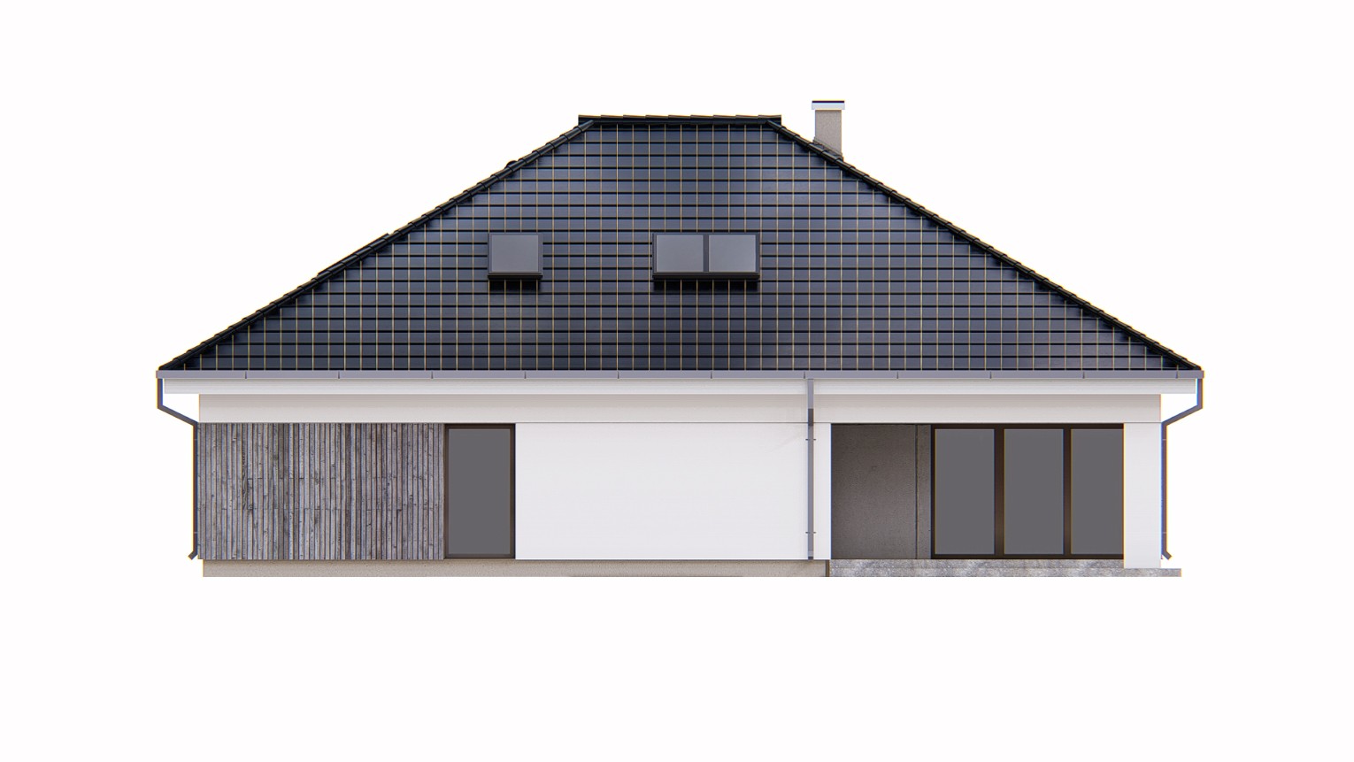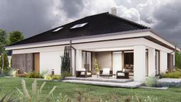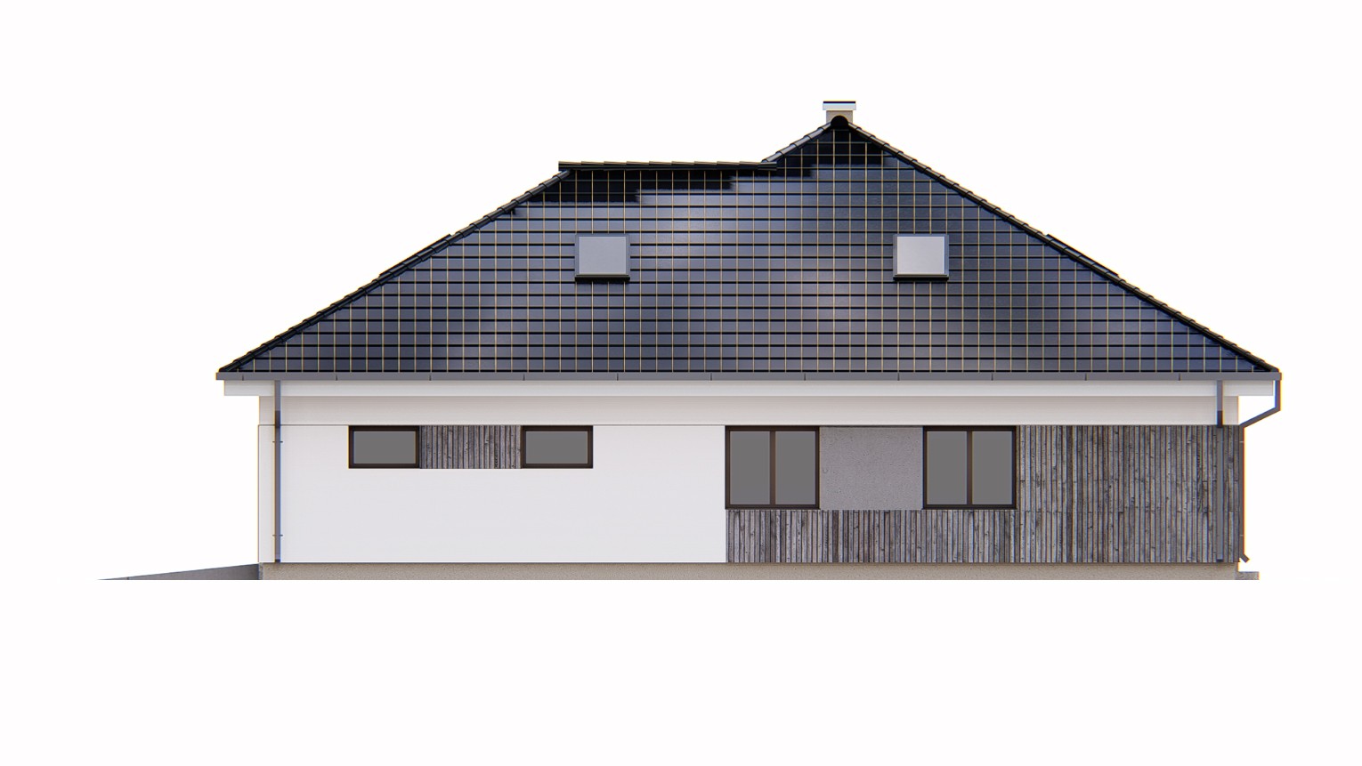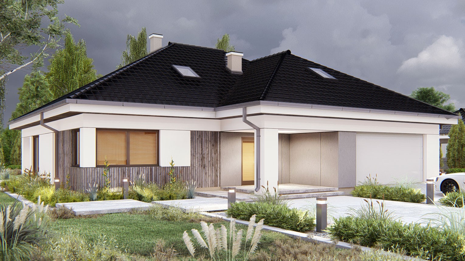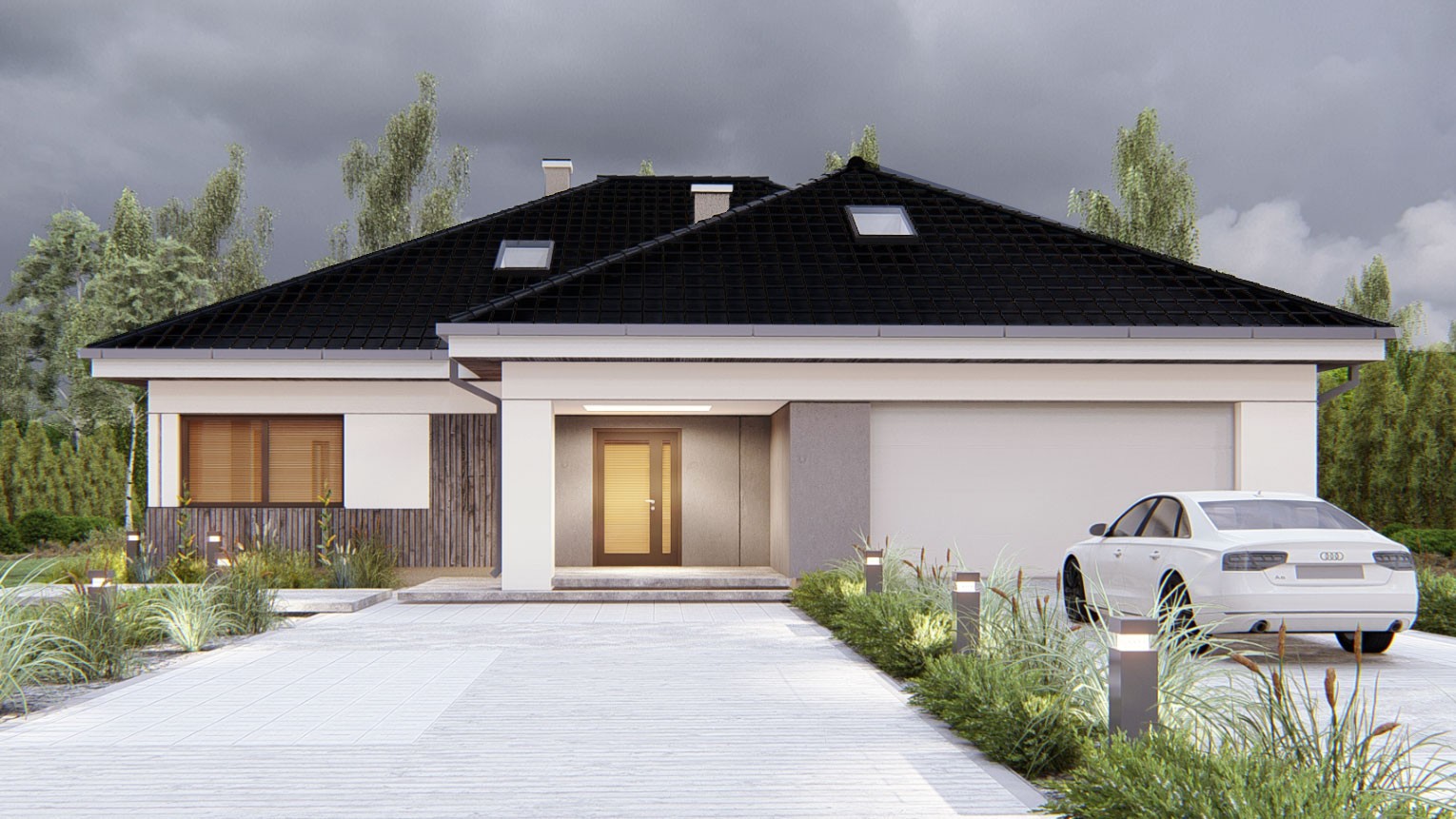 Gotowy projekt domu uA258 jest to atrakcyjna propozycja nowoczesnego projektu domu parterowego z antresolą. Estetyczny wygląd zewnętrzny uzyskano dzięki modnemu połączeniu materiałów elewacyjnych: naturalnego drewniana oraz białego i szarego tynku. W bryle tego gotowego projektu domu zaplanowano garaż na dwa auta połączony przejściem poprzez pomieszczenie gospodarcze z wiatrołapem. Do wnętrza domu prowadzi zadaszone, reprezentacyjne wejście główne z drzwiami z naświetlem bocznym. W wiatrołapie zaplanowano miejsce na szafę wnękowa. W wewnętrznym układzie funkcjonalnym zastosowano strefowanie, czyli jasny podział na strefy dzienną i nocną. Lewa strona domu to strefa dzienna. Sercem tego funkcjonalnego domu jest wysoki salon z antresolą, widokiem i wyjściem na ogród dodatkowo wyposażony w kominek. Ta klimatyczna przestrzeń będzie doskonałym miejscem rodzinnego wypoczynku domowników. W tej części domu zaprojektowano także jadalnię, która pomieści duży stół jadalny idealny do wspólnego spożywania posiłków. Uzupełnieniem strefy dziennej jest taras w podcieniu, który stanowi zewnętrzna strefę relaksu domowników. W tej części domu zaprojektowano również wygodną kuchnię z nowoczesną, wielofunkcyjną wyspą kuchenna oraz przyległa, podręczną spiżarnią. Na wprost wejścia znajduje się niewielka toaleta. W korytarzu zaplanowano schody na antresolę, która doskonale sprawdzi się jako biblioteczka czy strefa odpoczynku. W strefie nocnej znajdują się trzy sypialnie, w tym główna z garderobą, wspólna ogólnodostępna łazienka z wanną i prysznicem oraz praktyczna pralnia. Na poddaszu znajdują się dodatkowe pomieszczenia strychu z możliwością adaptacji na pomieszczenia mieszkalne oraz łazienka. Projekt uA258 zapewnia domownikom dostęp do 166 m2 powierzchni użytkowej mieszkalnej. Ten funkcjonalny i przemyślany projekt gwarantuje wygodne mieszkanie przez długie lata.