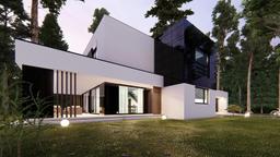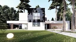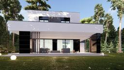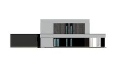 Gotowy projekt domu uA282 jest to propozycja nowoczesnego gotowego projektu domu z płaskim dachem o powierzchni użytkowej mieszkalnej 186 m2. Na zewnątrz nowoczesna bryła z ciekawym wykończeniem elewacji urozmaicona batonową pergolą zadaszającą taras. Ten piętrowy projekt domu z garażem dwustanowiskowym to przemyślana i funkcjonalna przestrzeń dla rodziny 2+2.  Na parterze zaplanowano strefę dzienną czyli przestronny, jasny salon ze strefą jadalnią, która będzie idealnym miejscem do organizacji przyjęć i spotkań. Kuchnia z wielofunkcyjna wyspą spełni oczekiwania każdej osoby lubiącej gotować. Na parterze znajduje się także idealny do pracy w ciszy gabinet oraz łazienka. Piętro bez skosów zapewnia maksymalną wygodę mieszkania domownikom. Zaplanowano tu główną sypialnię z garderobą oraz dwie bliźniacze ustawne sypialnie dla dzieci. Z poziomu korytarza mamy dostęp do ogólnodostępnej łazienki  z wanną i prysznicem oraz wydzielonym osobnym pomieszczeniem pralni. Gotowy projekt uA282 dzięki swej niepowtarzalnej bryle jest projektem wyjątkowym i  przyciągającym spojrzenia.