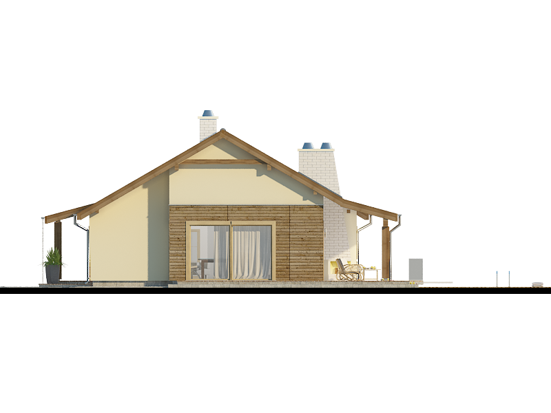 Na parterze została wyodrębniona część dzienna z przestronnym salonem, jadalnią, kuchnią i spiżarnią. Druga część domu to strefa nocna i indywidualne pokoje dla domowników. W środkowej części dostępna jest łazienka oraz dodatkowy WC. W tym miejscu można zaplanować schody na ewentualne poddasze (możliwość adaptacji części poddasza na użytkowe ok.28m2). Kotłownia z pralnią – suszarnią znajduje się po lewej stronie domu. Wersja podstawowa projektu posiada ogrzewanie gazowe, możliwe również ogrzewanie na paliwo stałe.