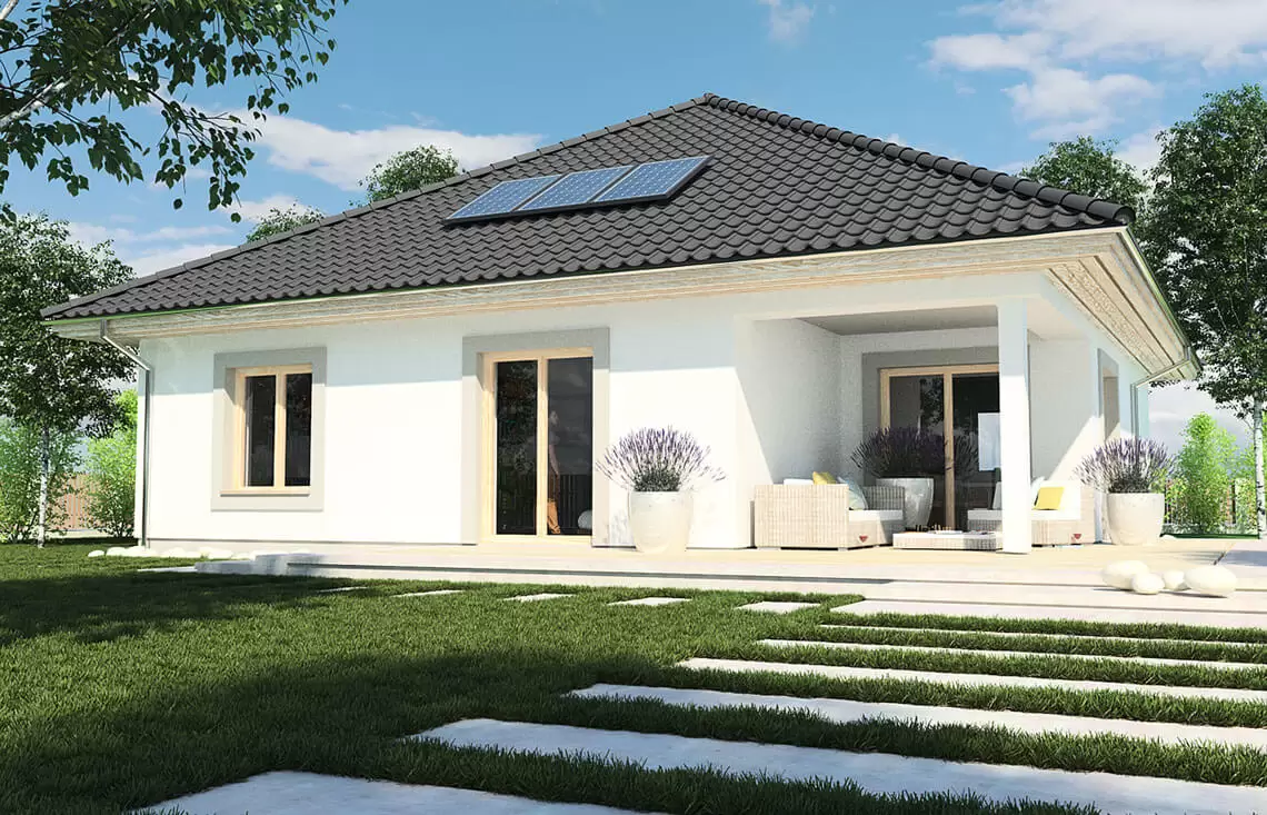 Przedstawiamy niezwykły projekt - Bella A, wyjątkowy w swej prostocie, nowoczesny dom parterowy z niezliczonymi możliwościami adaptacji poddasza. Jego klasyczna bryła wydaje się niemal stworzona dla tych, którzy szukają nie tylko elegancji, ale i funkcjonalności w swoim wymarzonym lokum. Począwszy od otwartej przestrzeni kuchni, jadalni i pokoju dziennego, która harmonijnie łączy się z zacienionym tarasem, każdy krok w Bella A jest studiem w zrozumieniu prawdziwego komfortu.