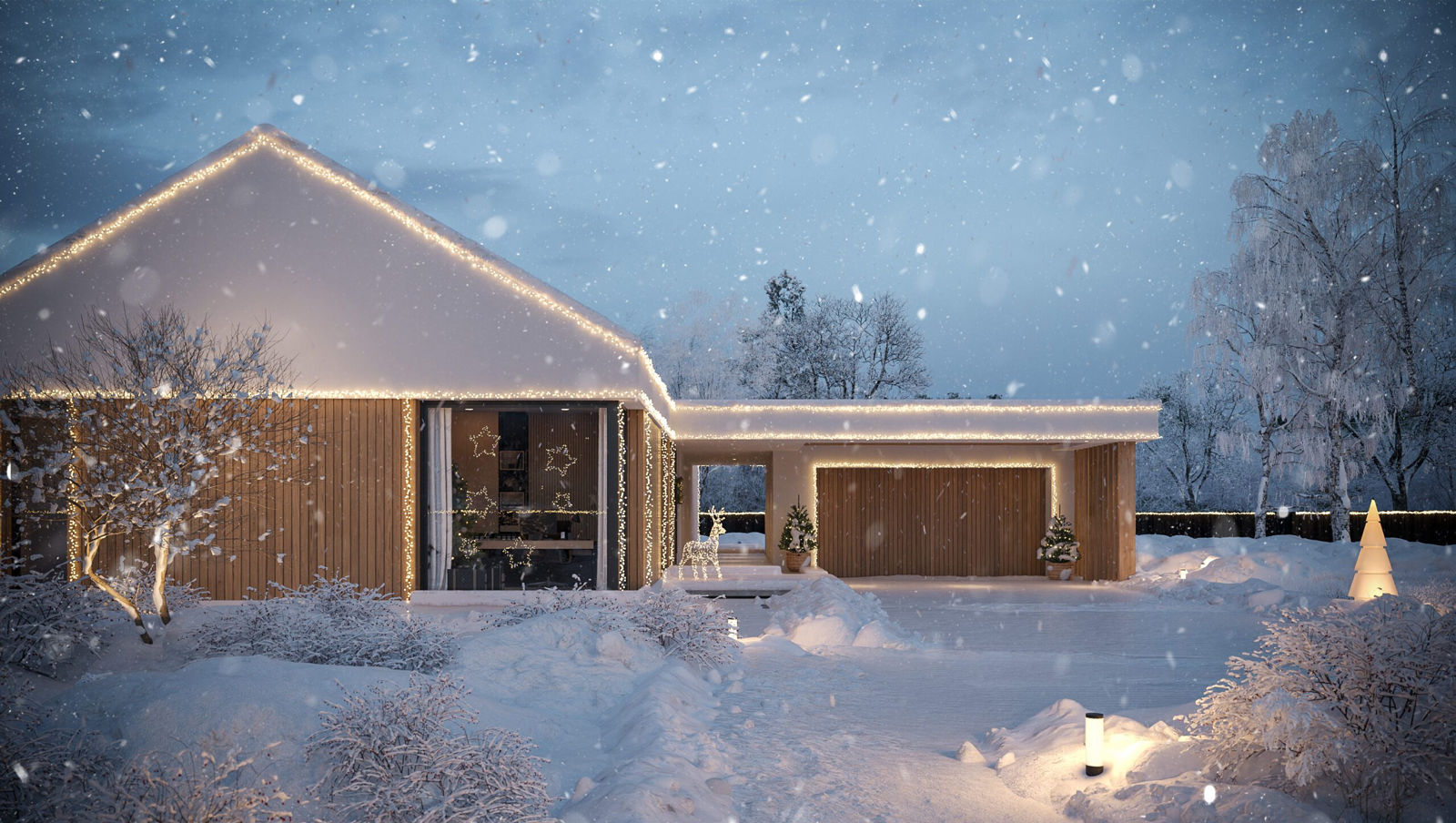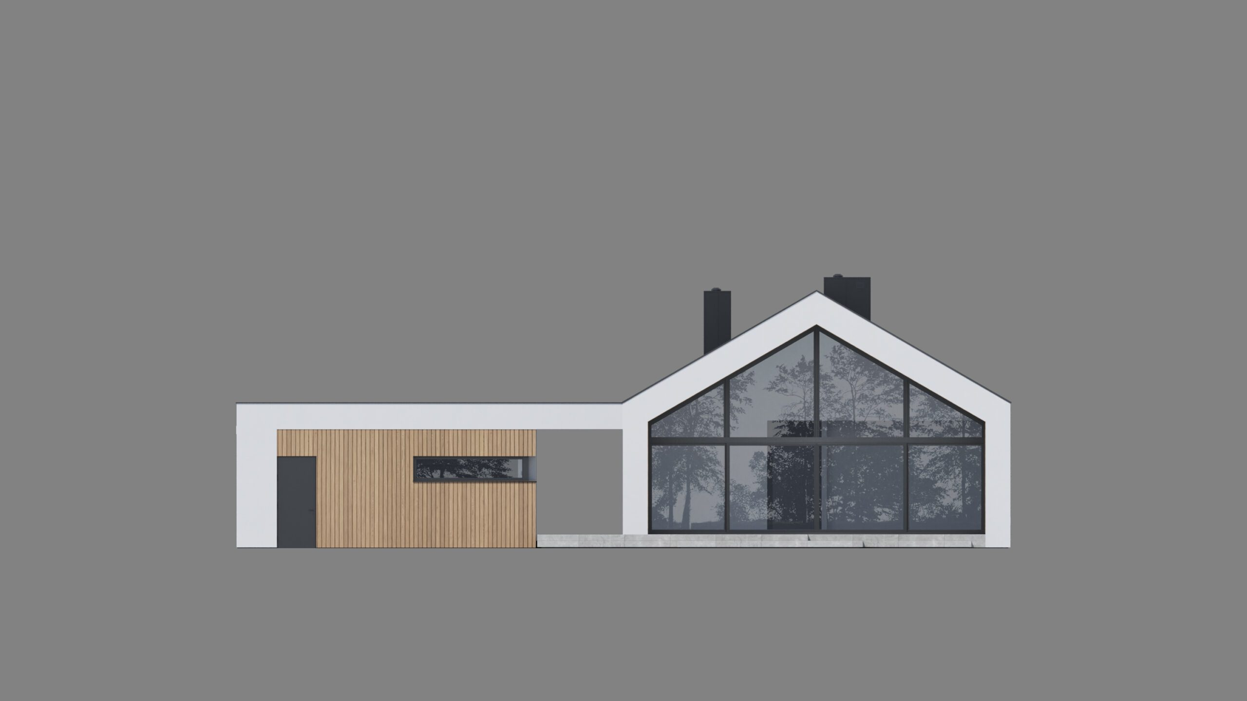Dom składa się z dwóch brył połączonych stropodachem. Pierwsza bryła to część mieszkalna z dachem dwuspadowym, a druga to dwustanowiskowy garaż z dachem płaskim. Fasada domu jest minimalistyczna i elegancka, z dużymi przeszkleniami, które zapewniają dostęp do światła dziennego. Drewniane detale podkreślają styl stodoły i nadają budynkowi ciepłego charakteru.