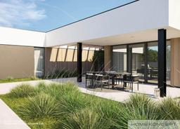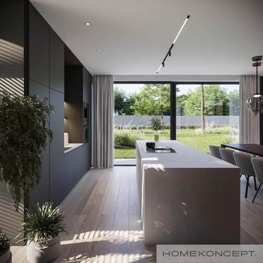 Dom Home Koncept 110 wyróżnia się nowoczesną architekturą w kształcie litery L. Płaski dach i eleganckie elewacje z grafitowymi detalami nadają mu wyjątkowy charakter. Duże przeszklenia otwierają wnętrze na otaczający ogród, tworząc harmonijną więź z naturą.