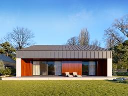 Fina to nietuzinkowy projekt domu parterowego, który zachwyca prostotą i funkcjonalnością. Zwarta bryła budynku na rzucie prostokąta i dwuspadowy dach bez okapów to charakterystyczne cechy nowoczesnej stodoły. Elewacja wykończona deską elewacyjną w kolorze naturalnego ciemnego drewna i dach pokryty blachą na rąbek stojący w grafitowym odcieniu nadają domowi elegancji i nowoczesnego charakteru.