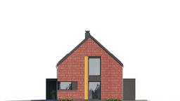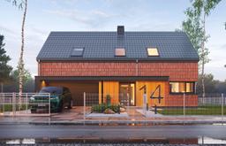 Projekt domu Dom na Zgrabnej 5, jest budynek parterowy z poddaszem użytkowym przeznaczonym dla 4- 5-osobowej rodziny. Budynek charakteryzuje się z jednej strony prostym i klarownym układem bryły i funkcji wnętrz, oraz z drugiej strony oryginalną nietuzinkową fasadą, idealną dla Inwestorów poszukujących oryginalnego wyrazu i ceniących cegłę jako trwały i ponadczasowy materiał wykończeniowy. Budynek jest parterowy z poddaszem użytkowym, zbudowany na planie prostokąta, w stylistyce nowoczesnej stodoły, przykryty dwuspadowym dachem z wysokimi ścianami kolankowymi poddasza. Front i elewację ogrodową dodatkowo urozmaicono zadaszeniami, z zastosowaniem kontrastowych materiałów i kolorystyki. Jednocześnie głównymi materiałami zastosowanymi za zewnątrz pozostaje cegła klinkierowa, oraz dachówka ceramiczna. Architektura domu jest minimalistyczna, z oszczędnym językiem detali. Od strony ogrodowej cała połać dachu może być przeznaczona do ułożenia paneli fotowoltaicznych. Duże przeszklenia otwierające wnętrze domu na taras i ogród, dodają bryle dynamicznego wyglądu i kontrastują z bardziej osłoniętym i zabudowanym frontem, mającym chronić wnętrze. Wejście do budynku podkreślone zostało kontrastowym wykończeniem ścian i liniowym podświetleniem zadaszenia nad podestem i schodami. Wnętrze domu podzielono na przestrzeń dzienną połączonych pomieszczeń salonu, holu i kuchni, oraz część garażowo-techniczną na parterze, oraz sypialnie/pokoje domowników na poddaszu. Parter i poddasze połączono przestrzennie pustką nad salonem - antresolą. Na poddaszu przewidziano cztery pokoje, w tym apartament rodziców z własną łazienką i garderobą, oddzielony od pozostałych sypialni antresolą i schodami. Minimalistyczna bryła domu i nowoczesne wydajne instalacje sprawiają, że budynek jest energooszczędny - będzie niedrogi i łatwy w późniejszej eksploatacji i utrzymaniu. Bazowo przyjęto ogrzewanie kotłem gazowym kondensacyjnym, lub pompą ciepła, ale można tutaj też zastosować kocioł na paliwo stałe. „Dom na Zgrabnej 5” to wygodny komfortowy dom, o nietuzinkowej oryginalnej architekturze, przyciągającej wzrok fasadzie, jednocześnie powściągliwej i nienarzucającej się stylistyce. Idealna propozycja dla Inwestorów planujących budowę solidnego, trwałego domu na lata, który przez długie lata będzie zawsze cieszył oko, nie zbudzi się i łatwo nie zestarzeje. Zapraszamy!