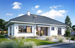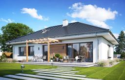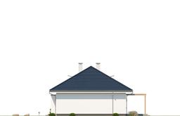 Projekt domu Wymarzony 11 C to jednorodzinny dom parterowy, przeznaczony dla 4-5cioosobowej rodziny z serii projektów „Wymarzony”. Dom zaprojektowano na prostokątnym rzucie, bez wcięć i wystających dobudówek. Przykryty jest symetrycznym czterospadowym dachem z okapami, o kącie 30 stopni, z kalenicą równoległą do elewacji frontowej. Dom w spokojnej architekturze, w tradycyjnej formie, z nowoczesnymi detalami, o proporcjonalnej bryle, z ładnie osadzonym kopertowym dachem. Zarówno bryła jak i stylistyka domu przywołują na myśl spokój, harmonię, prostotę i solidność. Elewacja frontowa jest symetryczna, z środkowo usytuowanym wejściem, podkreślonym kontrastową cofniętą ścianą i zadaszeniem nad podestem wejściowym. Elewację ogrodową zdobi szerokie przeszklenie otwierające salon na taras, z fragmentem ściany z okładziną drewnianą, oraz częściowym zadaszeniem tarasu. Zadaszenie można wykonać jako pergolę, albo zadaszenie pełne - dowolnie wedle decyzji właścicieli. Wnętrze budynku podzielono na część dzienną - z salonem, holem i kuchnią, oraz część z pokojami sypialnymi. Przestrzeń dzienna składa się z holu, jadalni i części wypoczynkowej ze ścianą telewizyjno-kominkową i wyjściem na taras. Kuchnia jest delikatnie oddzielona od pokoju dziennego - posiada niewielką spiżarnię i duże okno z widokiem na front działki. Kotłownię przewidzieliśmy przy wejściu, dostępną z przedsionka. Bazowo w projekcie przyjęto kotłownię gazową, ale można tutaj zastosować też kocioł na paliwo stałe. W części nocnej mamy trzy sypialnie, w tym oddzielny apartament rodziców z własną garderobą i łazienką, dwie sypialnie dziecięce, dodatkowy pokój - np. gabinet / domowe biuro i dużą ogólnie dostępną łazienkę. Pokoje można wykorzystać w różny sposób. Można też bardzo łatwo przestawiać ściany działowe, zmieniając ilość i wielkość pomieszczeń. Nad parterem do dyspozycji mamy dużą przestrzeń strychową do dowolnej adaptacji i wykorzystania. W budynku nie przewidziano wbudowanego garażu, aby nie marnować cennej powierzchni użytkowej. W domu zastosowano nowoczesne materiały i technologie, energooszczędne instalacje i dobre izolacje przegród zewnętrznych. Dzięki temu koszt późniejszej eksploatacji będzie niski. Dom ma prostą konstrukcję i będzie łatwy i niedrogi w budowie. Wymarzony 11 C to propozycja dla osób myślących o budowie komfortowego domu parterowego, o ładnej bryle z czterospadowym dachem, o ponadczasowej architekturze. Domu, o sensownej skali, w którym można poczuć przestrzeń i wygodę. Zapraszamy !