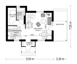 Projekt domu Okruszek jest rozbudowaną wersją projektu domu Sosenka. Budynek powiększony został o pomieszczenie gospodarcze na parterze, przedsionek z daszkiem przed wejściem i zadaszony częściowo taras. Projekt domku Okruszek jest świetnym rozwiązaniem dla małej rodziny, może służyć zarówno jako dom letniskowy jak i całoroczny. Budynek jest tani w budowie, jak i późniejszej eksploatacji. Jego bryła ukształtowana zaprojektowana została z myślą o ewentualnej rozbudowie. Częściowe podpiwniczenie może być pomocne przy konieczności umieszczenia w domu np. hydroforu. Duży salon na parterze z kominkiem, z wyjściem na częściowo zadaszony taras. Na poddaszu zaprojektowano dwie obszerne sypialnie. Pracownia posiada odbicie lustrzane projektu domu Okruszek oraz wersję niepodpiwniczoną lub z całkowitym podpiwniczeniem. Zapraszamy do obejrzenia wszystkich domków z tej serii: https://www.mgprojekt.com.pl/okruszek, https://www.mgprojekt.com.pl/okruszek-wariant-b, https://www.mgprojekt.com.pl/okruszek-wariant-e