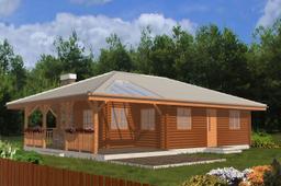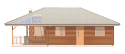 Projekt domu Pogodny Drewniany to mały i ekonomiczny domek z bali drewnianych. Parterowy, niepodpiwniczony, o prostej i wyważonej bryle, dla czteroosobowej rodziny. Może być traktowany zarówno jako dom jednorodzinny, jak i letniskowy. Budynek posiada czytelny i funkcjonalny rozkład pomieszczeń oraz wyraźny ich podział na strefy: dzienną i nocną, co daje poczucie komfortu i wygody. Obszerny zadaszony taras zapewnia możliwość korzystania z zewnętrznego kominka (grilla) bez względu na warunki atmosferyczne. Kominek, zlokalizowany w salonie umożliwia rozprowadzenie ciepła po całym domu. Projekt domu Pogodny Drewniany dostępny jest w technologii drewnianej oraz murowanej. Pracownia dysponuje także wersją z poddaszem użytkowym. Każdy z wariantów projektu dostępny jest ponadto w odbiciu lustrzanym. Komplet czterech egzemplarzy zawiera: projekt architektury domu, konstrukcji oraz schematy instalacji wewnętrznych. Na prośbę Inwestora, do projektu dołączamy zgodę na dokonanie zmian według życzenia Klienta.