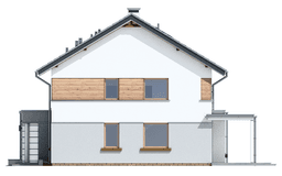 Dom Miranda stworzono na planie kwadratu, przekryto go dwuspadowym dachem. Lekko wystający garaż z podcieniem wejściowym, zadaszenie nad tarasem ogrodowym, okładziny naścienne wokół okien - wszystkie te elementy urozmaicają sylwetkę nadając jej atrakcyjny wygląd.