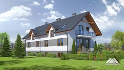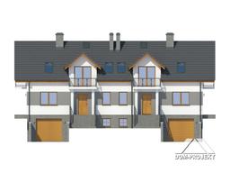 Dom jednorodzinny dwulokalowy. Podpiwniczony, z poddaszem użytkowym. W każdym segmencie: duży salon z aneksem kuchennym, wyjściem na balkon i schodami na poddasze, pokój, łazienka, wiatrołap i zejście do piwnicy. Na poddaszu trzy pokoje, łazienka, dwa balkony. W piwnicach garaż, kotłownia i piwnica. Prosta bryła budynku i dach dwuspadowy sprzyjają szybkiej i taniej budowie i niskim kosztom eksploatacji.
