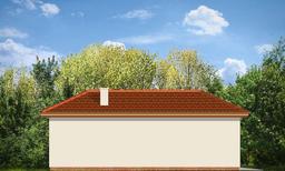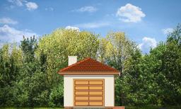Garaż jednostanowiskowy z pomieszczeniem gospodarczym z tyłu (dostępny również jako budynek gospodarczy) przykryty dachem wielospadowym z dodatkowym wyjściem od strony elewacji bocznej.